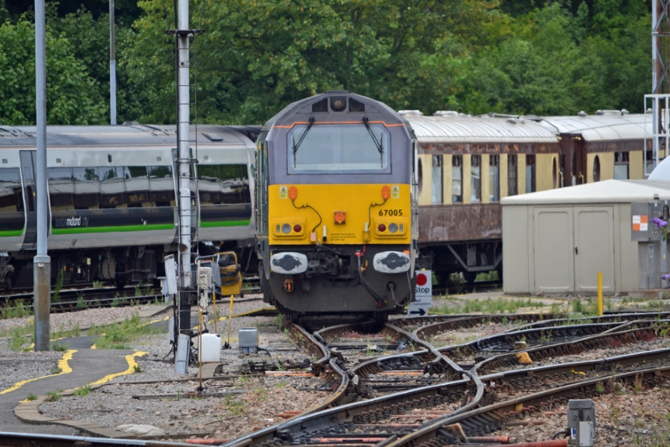 No.67005 and Pullman Car stock at Worcester Shrub Hill on 2nd July 2011. Photograph taken by Andrew Smith.