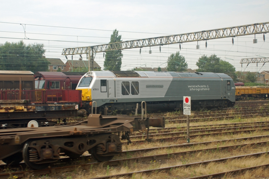 Wrexham & Shropshire was the operating name of the former Wrexham, Shropshire and Marylebone Railway Company. The company had a seven-years agreement to operate passenger train services from Wrexham via Shropshire to London on an open-access basis. Services began to great acclaim on 28th April 2008 but lasted less then three years before its parent company closed down the service on 28th January 2011. No.67013, seen here at Bescot on 24th July 2008, was one of four locomotives, the others were Nos. 67010, 67011 and 67012, that were repainted in this distinctive livery. Photograph taken by Andrew Smith.
