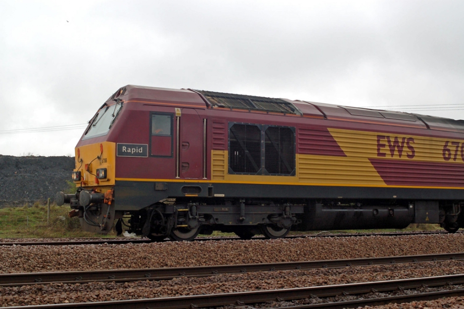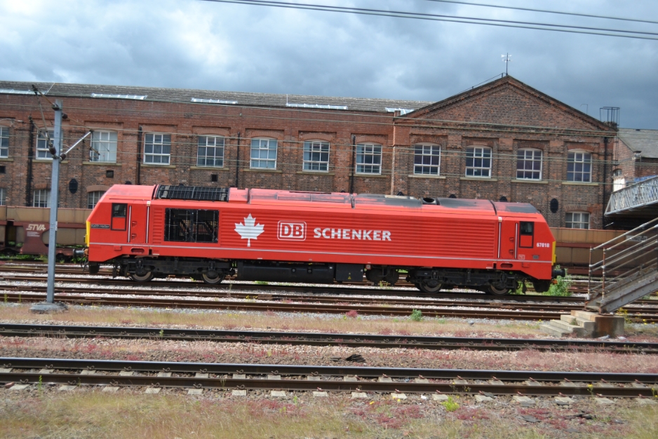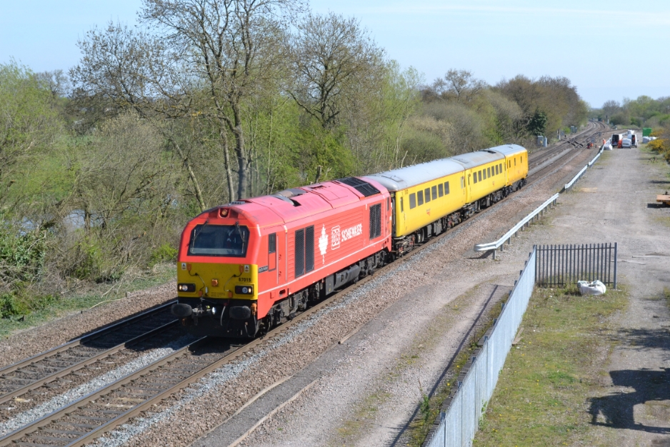No.67018, in DB Schenker livery and called "Keith Heller", with a test train at Willington. Photograph taken by Adrian Booth on 22nd April 2015.